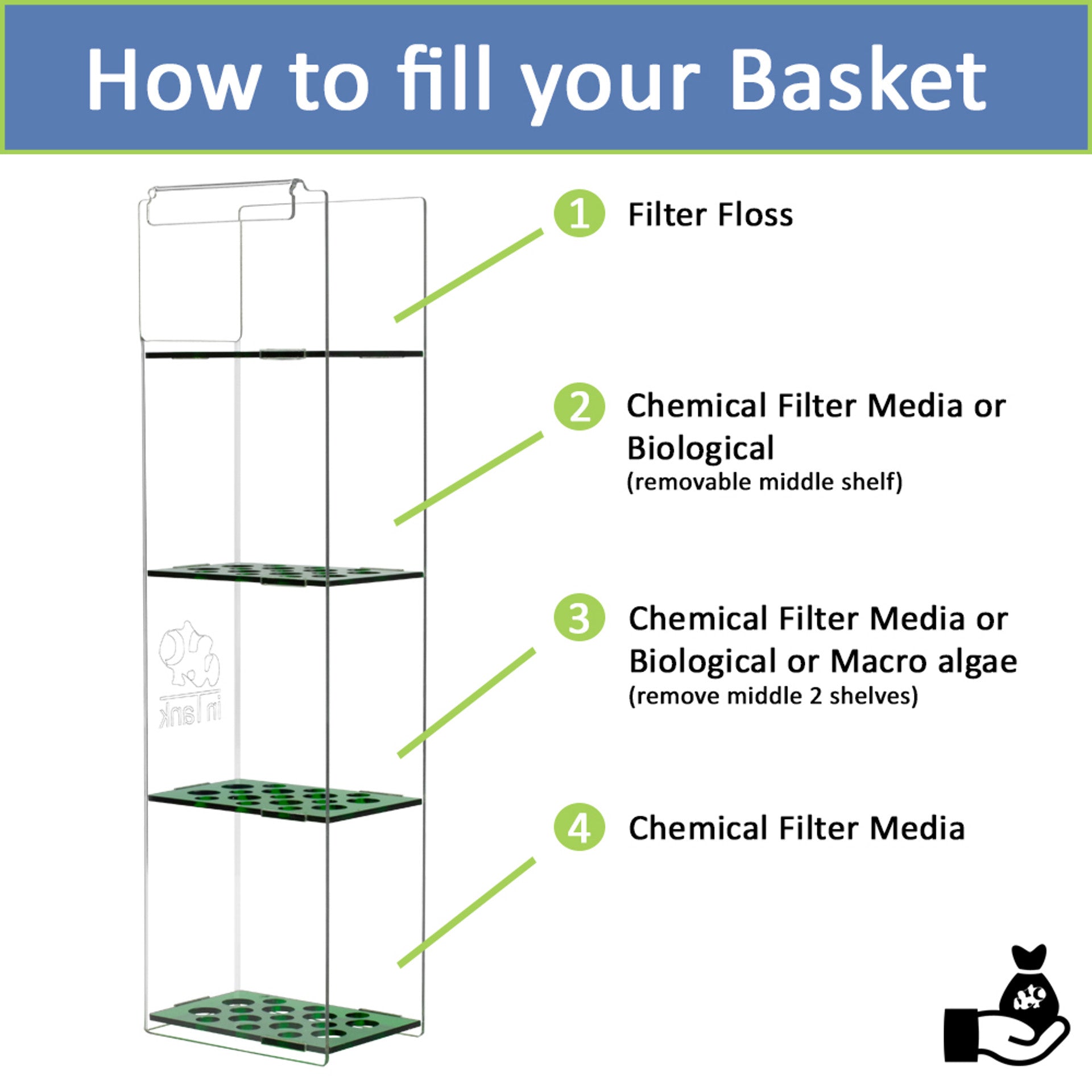 inTank aquarium-specific designed Media Baskets help improve the filtration and clarity of your aquarium while making maintenance extremely easy. What once was a dreaded chore of chaining filters and diving into the aquarium is now made easy utilizing a 3-Sided Tower Design system. The Media Basket uses the false wall or rear glass to box in once installed forcing water through media.