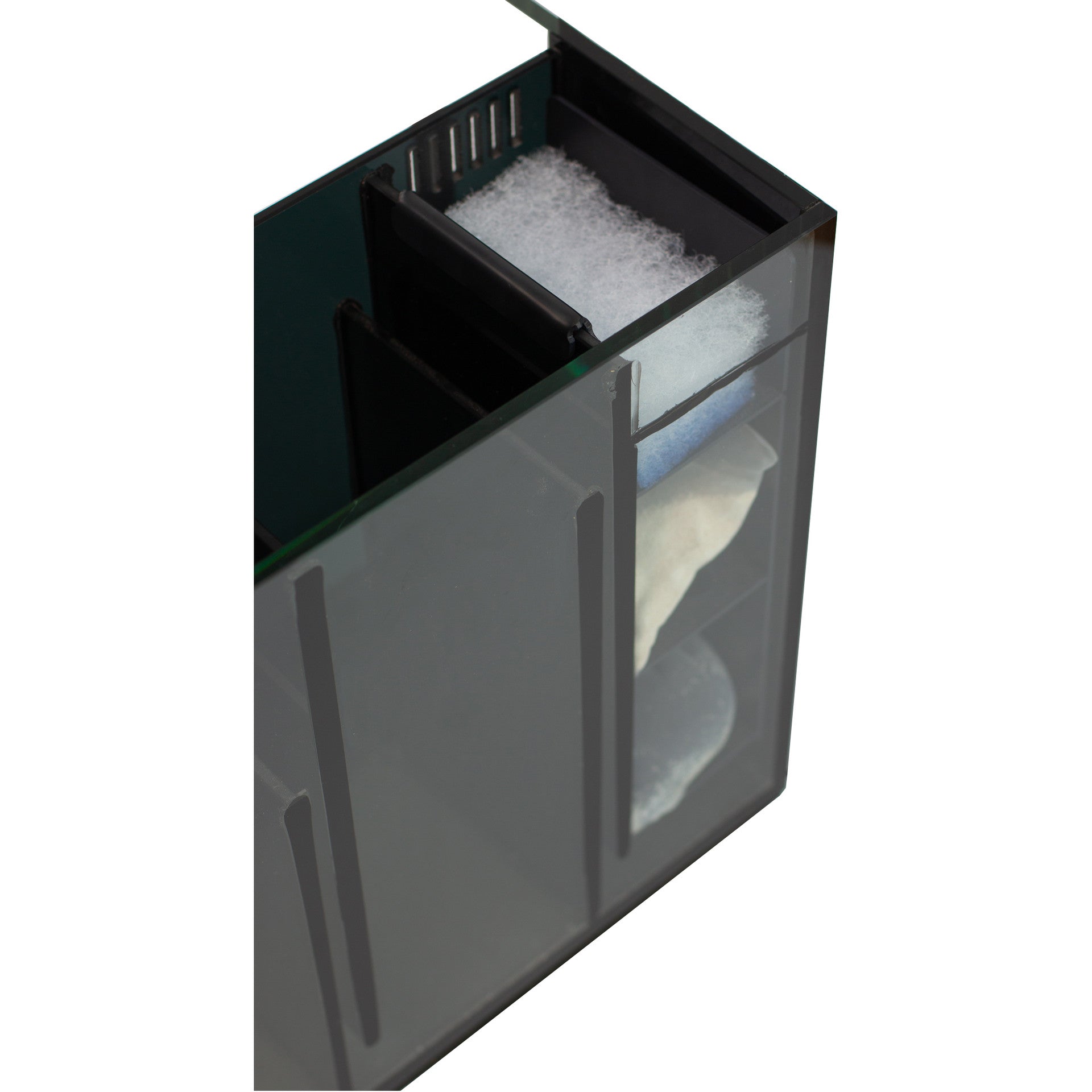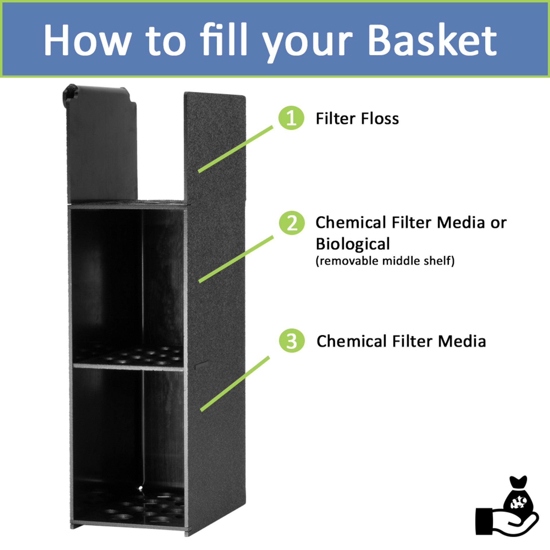 inTank aquarium-specific designed Media Baskets help improve the filtration and clarity of your aquarium while making maintenance extremely easy. What once was a dreaded chore of chaining filters and diving into the aquarium is now made easy utilizing a 3-Sided Tower Design system. The Media Basket uses the false wall or rear glass to box in once installed forcing water through media.
