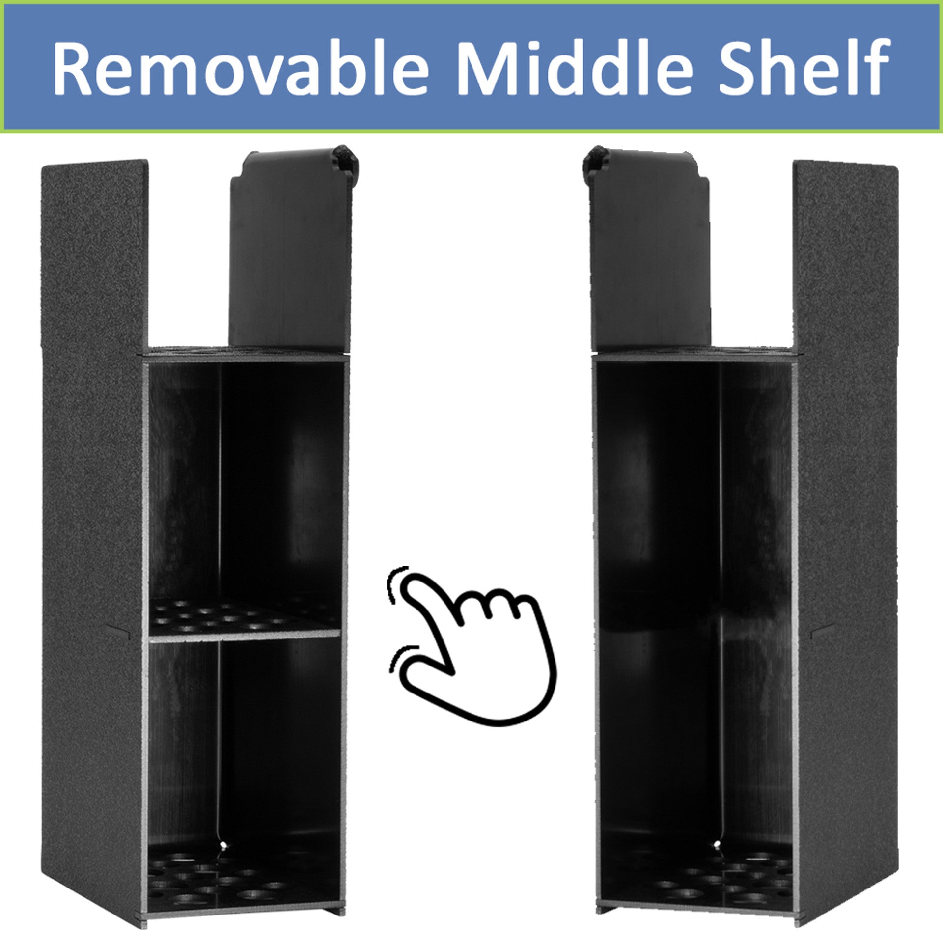 - Features a bent hanging bracket and a 3 shelf design. The middle shelf is removable