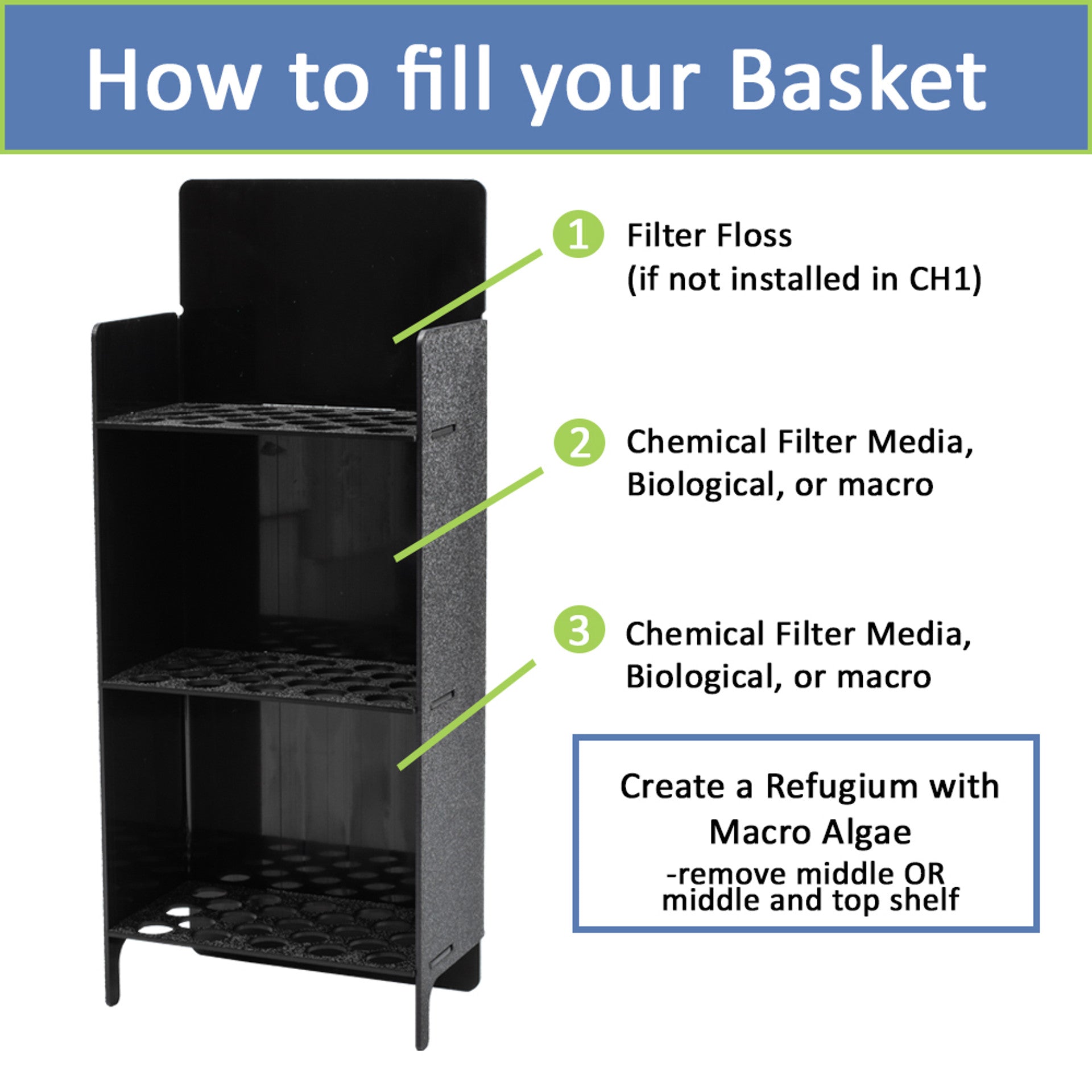 - Can be used to create a refugium with macro algae by removing the top and middle shelf