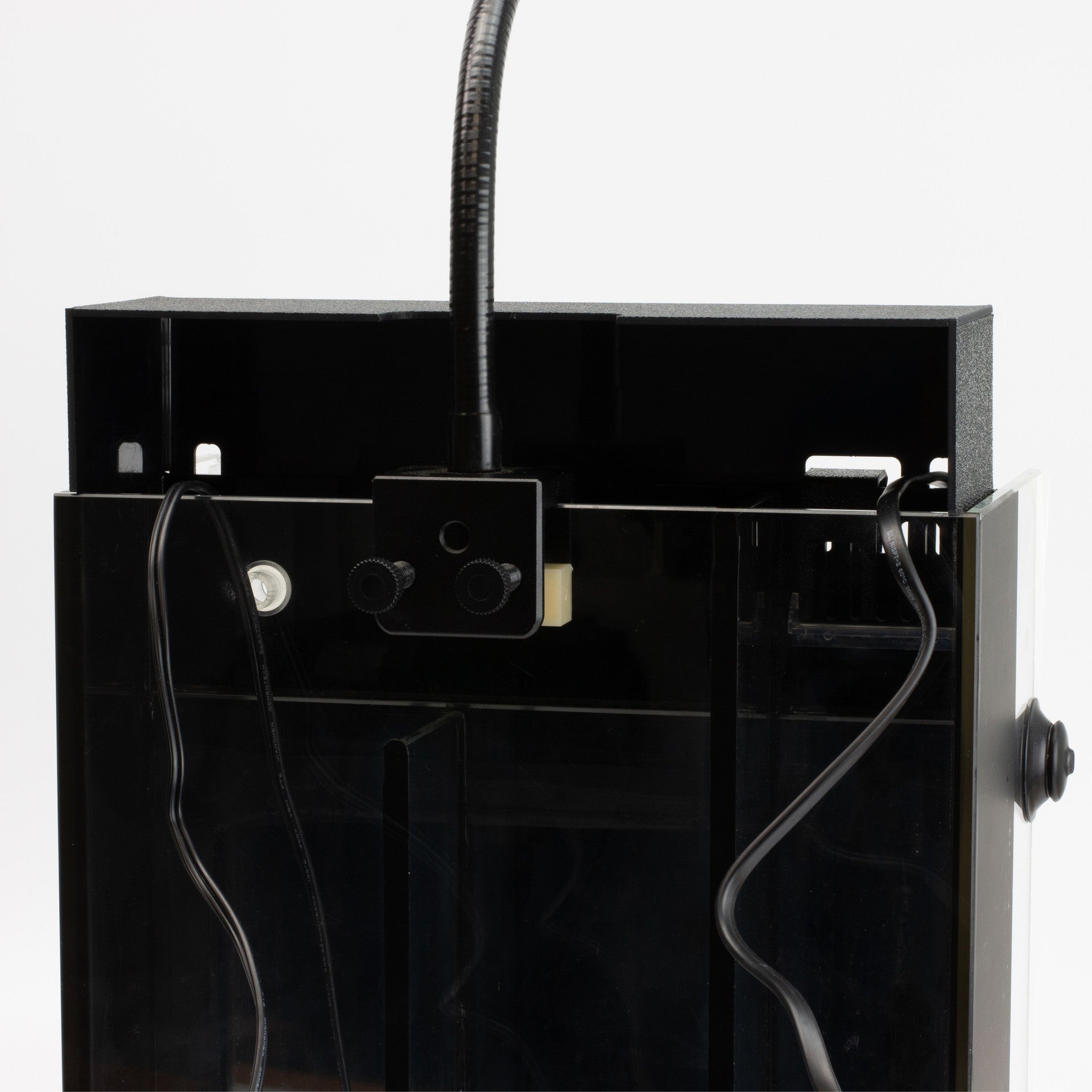 inTank aquarium-specific designed Filtration Covers hide unsightly equipment and cords around the rear filtration area. This cover is designed with notches to lock onto the false wall and rear glass. It features a knockout in the middle that can be removed without tools so that a lighting goose neck or mount can be installed to the rear of the aquarium.
