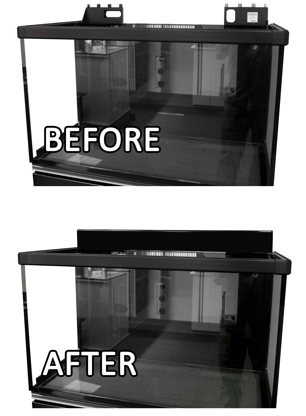 inTank aquarium-specific designed Filtration Covers hide unsightly equipment and cords around the rear filtration area. After you remove the stock lighting hood this filtration cover will hide equipment and cords providing a custom look that blends into the aquarium moldings.