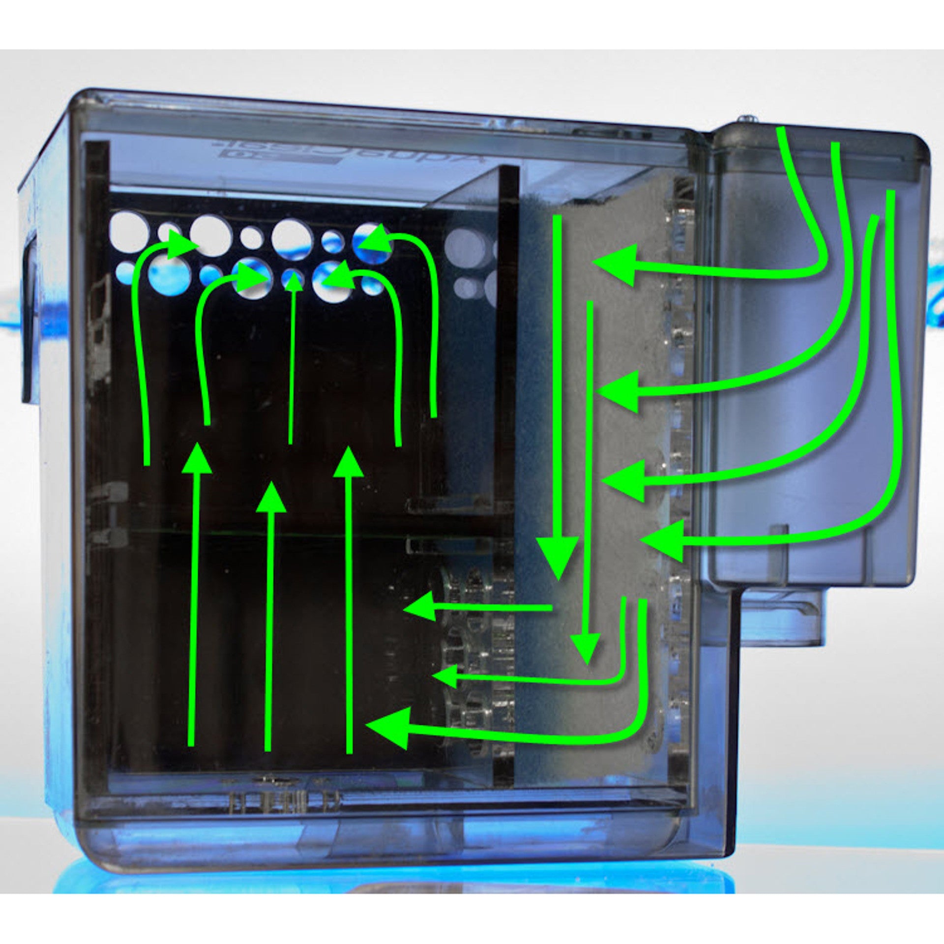 - Water is forced to hit filter floss first, trapping detritus keeping filtration media clean and the aquarium clear