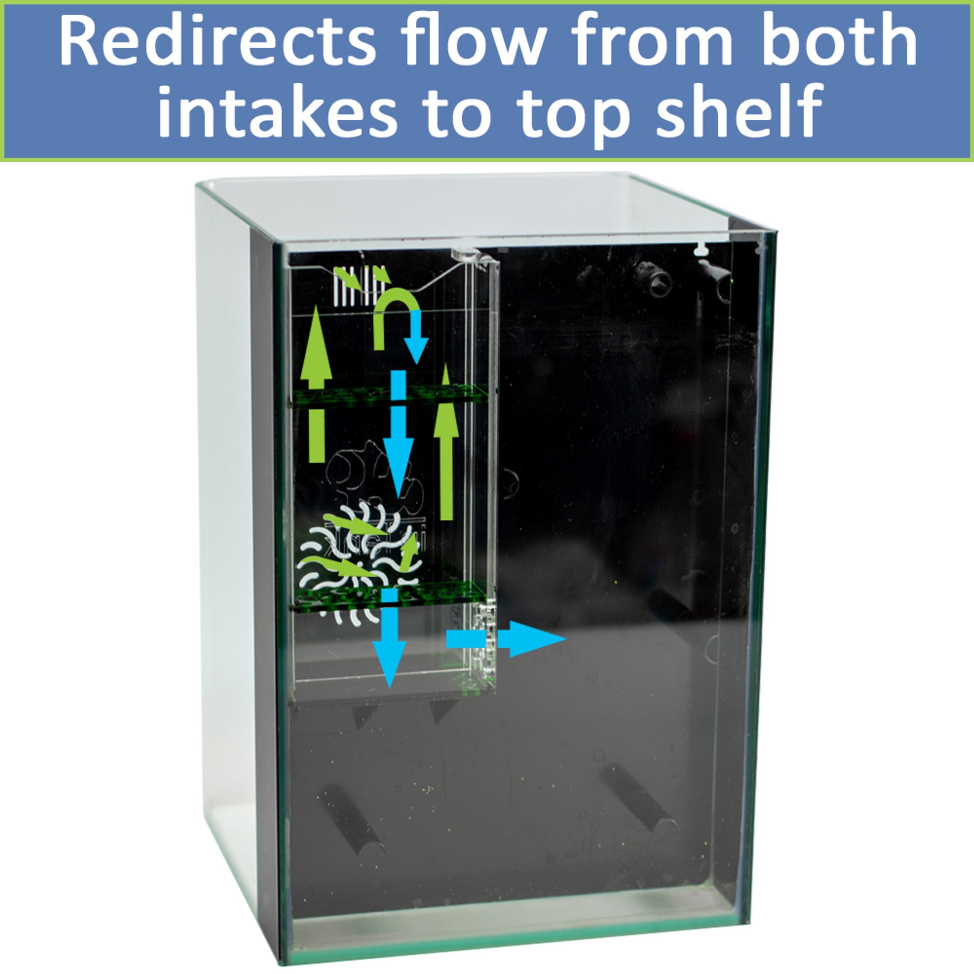 - Basket redirects flow from the larger lower intake causing water to enter the top shelf for proper filtration