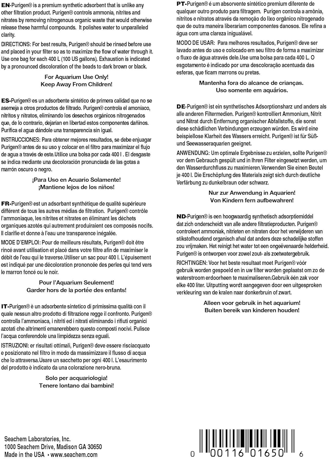 Purigen is a premium synthetic adsorbent that is unlike any other filtration product. It is not a mixture of ion exchangers or adsorbents, but a unique macro-porous synthetic polymer that removes soluble and insoluble impurities from water at a rate and capacity that exceeds all other competing products by over 500%. Purigen controls ammonia, nitrites and nitrates by removing nitrogenous organic waste that would otherwise release these harmful compounds. Purigen’s impact on trace elements is minimal. It significantly raises redox. It polishes water to unparalleled clarity. Purigen darkens progressively as it exhausts, and is easily renewed by treating with bleach. Purigen is designed for both marine and freshwater use.